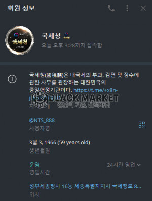 🔹 [계좌매입 먹튀 사건] 국세청 사칭 텔레그램 계정 (2025-10-07)⚠️ 블랙마켓 - '뽀로로'의 전체 사기 이력 조회🧾 사기 계정 정보- 텔레그램 닉네임: 국세청- 사용자명: @NTS_888- 활동: "불법 사이트 입금 계좌, 환전 내역 매입" 광고- 공범 채널: 뽀로로 채널 연계📅 피해 일시2025년 10월 초 (10월 2일 ~ 6일 대화 기록 확인됨)🧩 사건 개요'국세청'이라는 명칭을 도용한 텔레그램 계정(@NTS_888)은 불법 사이트 계좌 매입을 명목으로 피해자에게 접근.토토, 카지노, 슬롯, 스포…