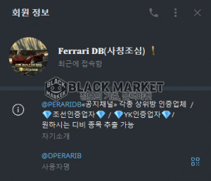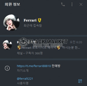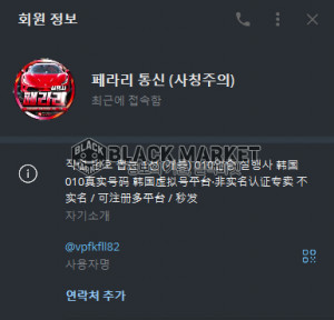 🔹 [유심·카톡 인증 사기] ‘페라리 통신(사칭주의)’ 카카오 계정 대여 사기⚠️ 블랙마켓 - '페라리 통신'의 이전 사기 이력 조회🧾 사기 계정 정보- 닉네임: 페라리 통신 (사칭주의)- 텔레그램: @vpfkfll82- 프로필 문구: 010 인증 / 신규 카카오 개설 / 무피해 보장 등 기재- 공지 협력 계정: @h_hsad01 (프로필 내 표기)📅 발생 일시2025년 11월 12일 ~ 13일 새벽(새벽 인증 → 12시간 동안 연락두절)🧩 사건 개요피해자는 ‘카카오 신규 계정 생성용 무피해 인증’을 홍보하는텔레그램 계정 ‘페라리 …
