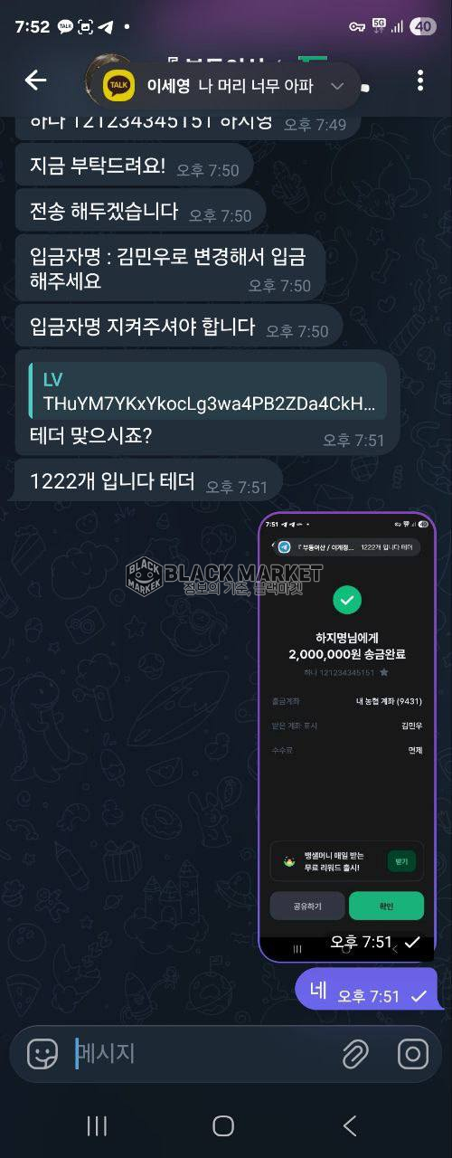- 입금 전후 대화 기록, 테더 주소 제공 내역 존재
