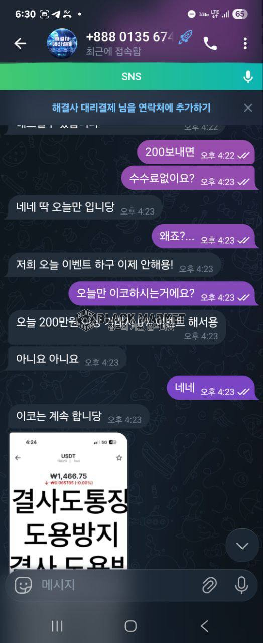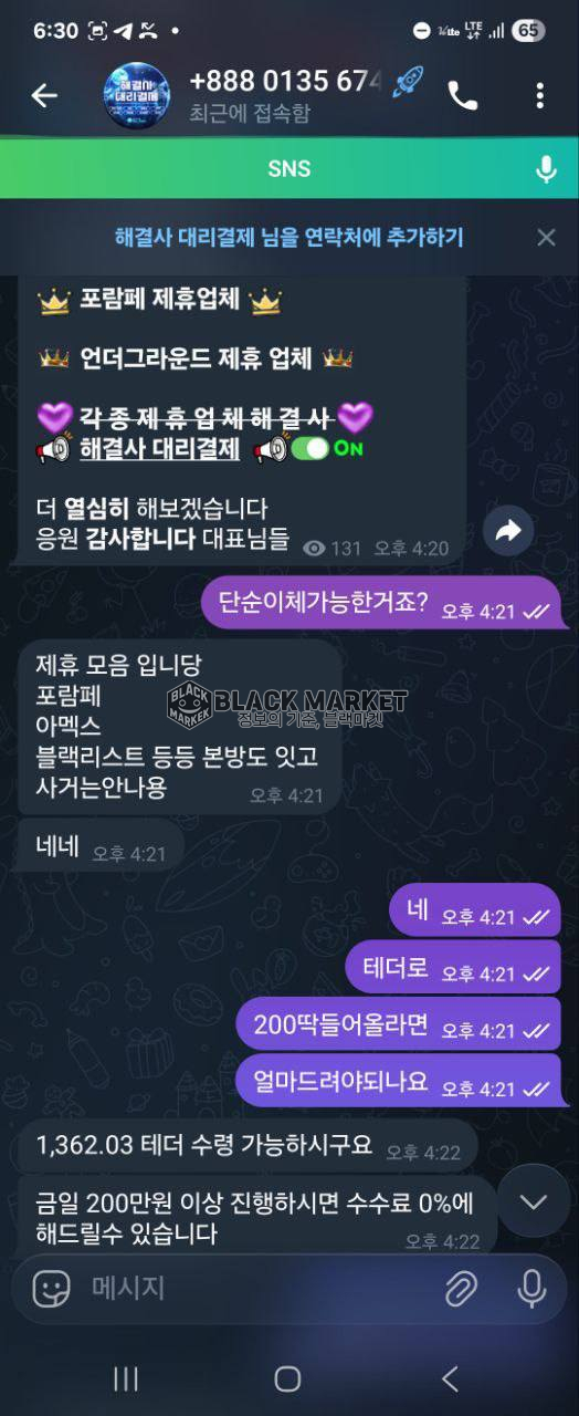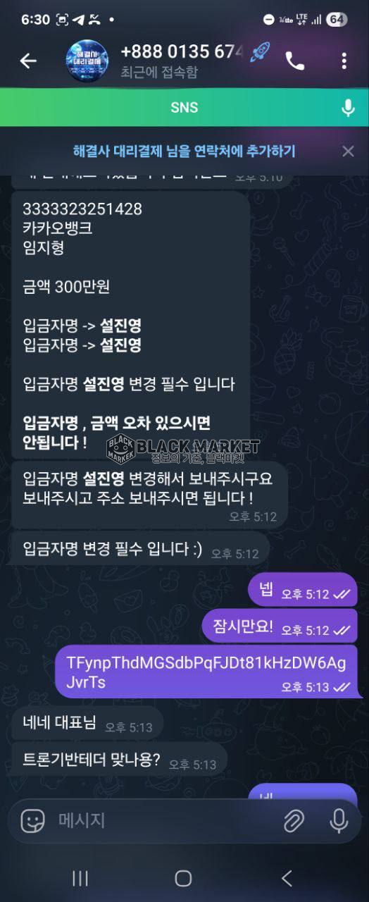 대리결제 진행을 유도한 뒤, 테더 및 계좌이체 방식으로 결제를 요구함.