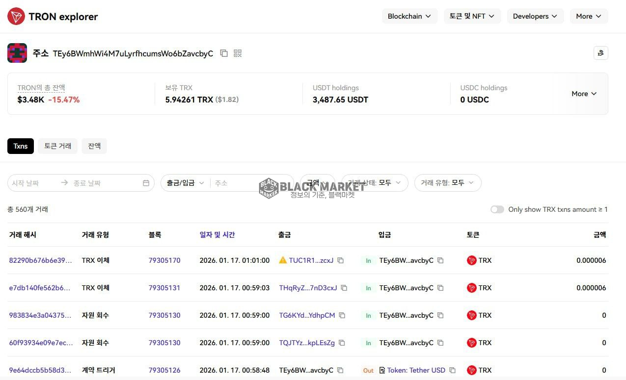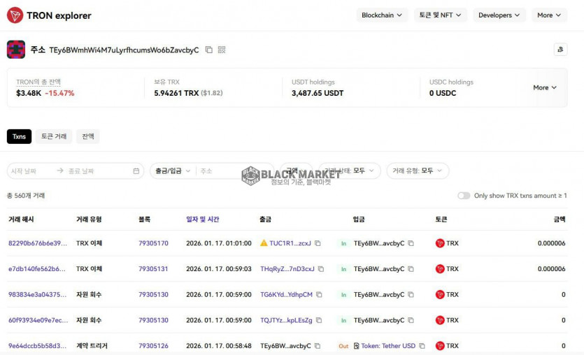 - 트론 익스플로러 상 확인 지갑에 USDT 보유 내역 존재