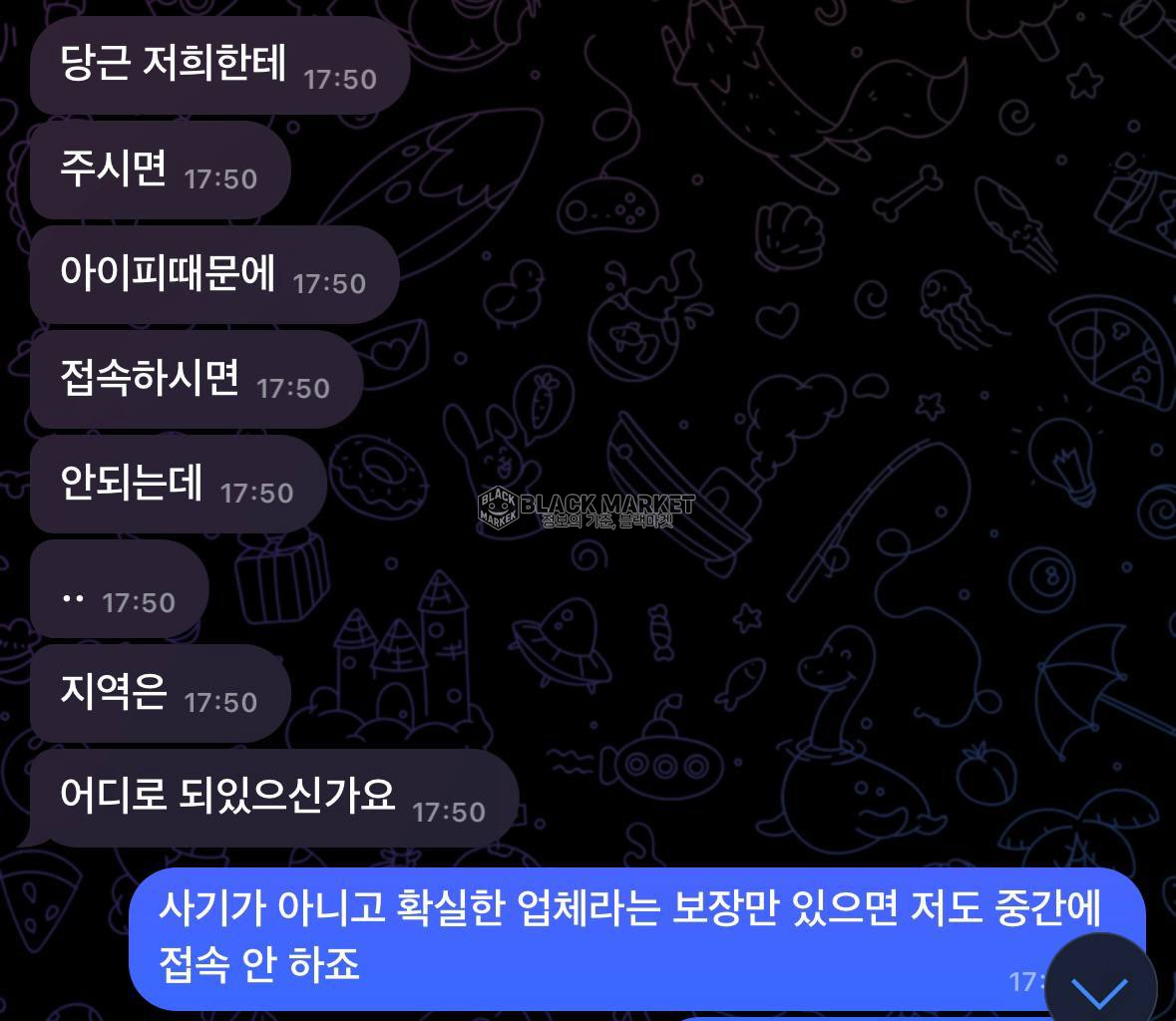 블랙마켓은 선불유심, 대리결제, DB 판매, 텔레그램 강제 초대, 솔루션 먹튀, 가상계좌, 광고 대행, 흥신소 등 다양한 음지 업계에서 발생하는 사기 피해를 수집하고 공유하는 실시간 정보 플랫폼입니다.