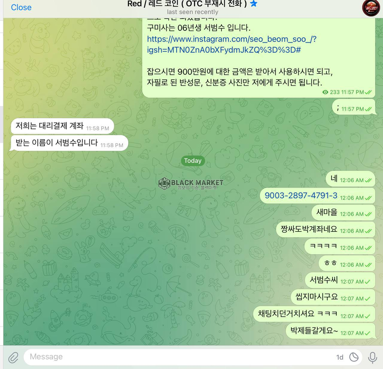 피해자는 레드코인 OTC 명목으로 30만원 거래를 시도했으나, 상대방은 송금 계좌로 "서범수" 명의의 새마을금고 계좌(9003-2897-4791-3)를 제시.