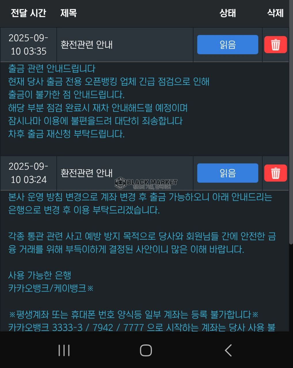 사이트 측은 **출금 계좌 변경 요구 → 계좌 점검 중이라 오전 중 처리 예정** 등의 핑계를 대며 출금을 지연.