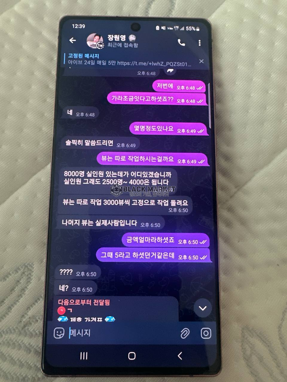 - 제보자는 제휴를 거부했으나, "하루 뒷텔 작업 시 5만원" 조건으로 협의 진행.