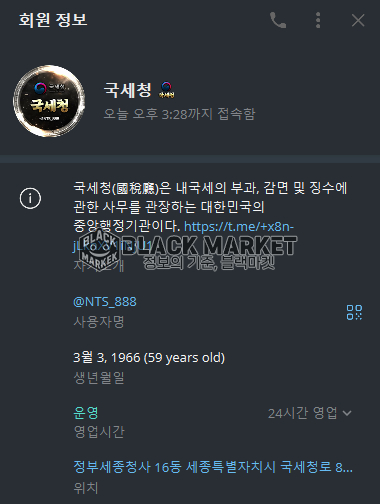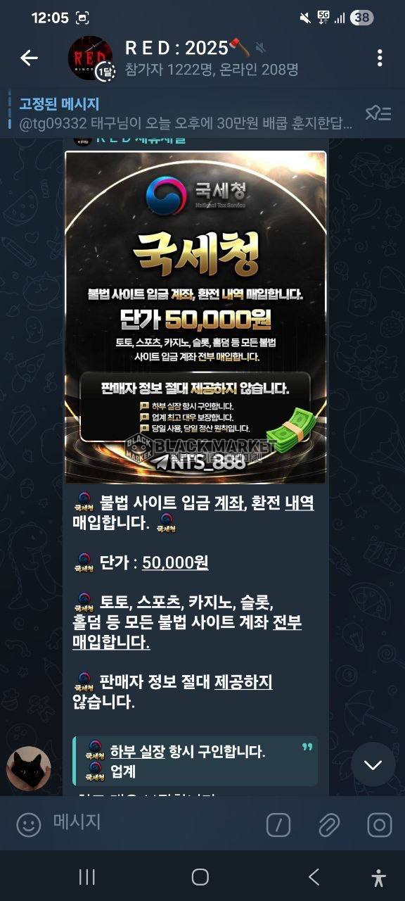 '국세청'이라는 명칭을 도용한 텔레그램 계정(@NTS_888)은 불법 사이트 계좌 매입을 명목으로 피해자에게 접근.