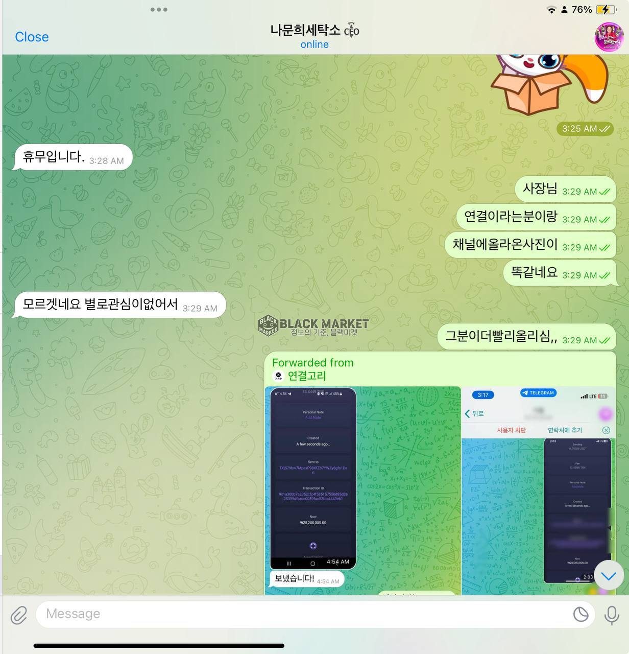 - 채널 내 다수의 허위 인증 사진(현금, 거래내역 등)을 게시하며 신뢰 유도