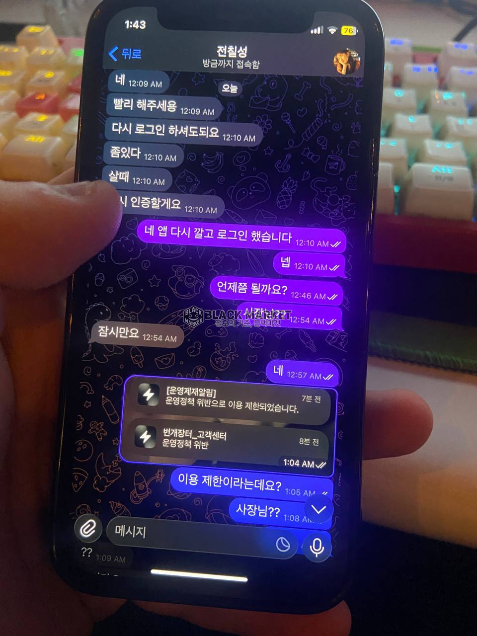 이후 번개장터 이용제한 알림이 뜨자 피해자가 확인 요청을 하였으나, 전칠성은 잠수 및 미응답 상태로 전환됨.