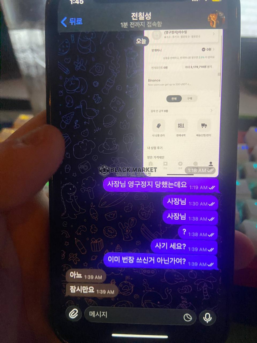 이후 번개장터 이용제한 알림이 뜨자 피해자가 확인 요청을 하였으나, 전칠성은 잠수 및 미응답 상태로 전환됨.