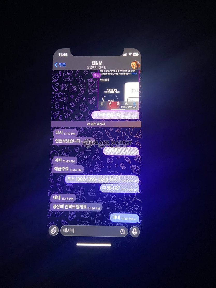 피해자는 텔레그램 사용자 ‘전칠성(@bodybiildrr01)’에게 번개장터 계정 9만원에 판매를 진행함.