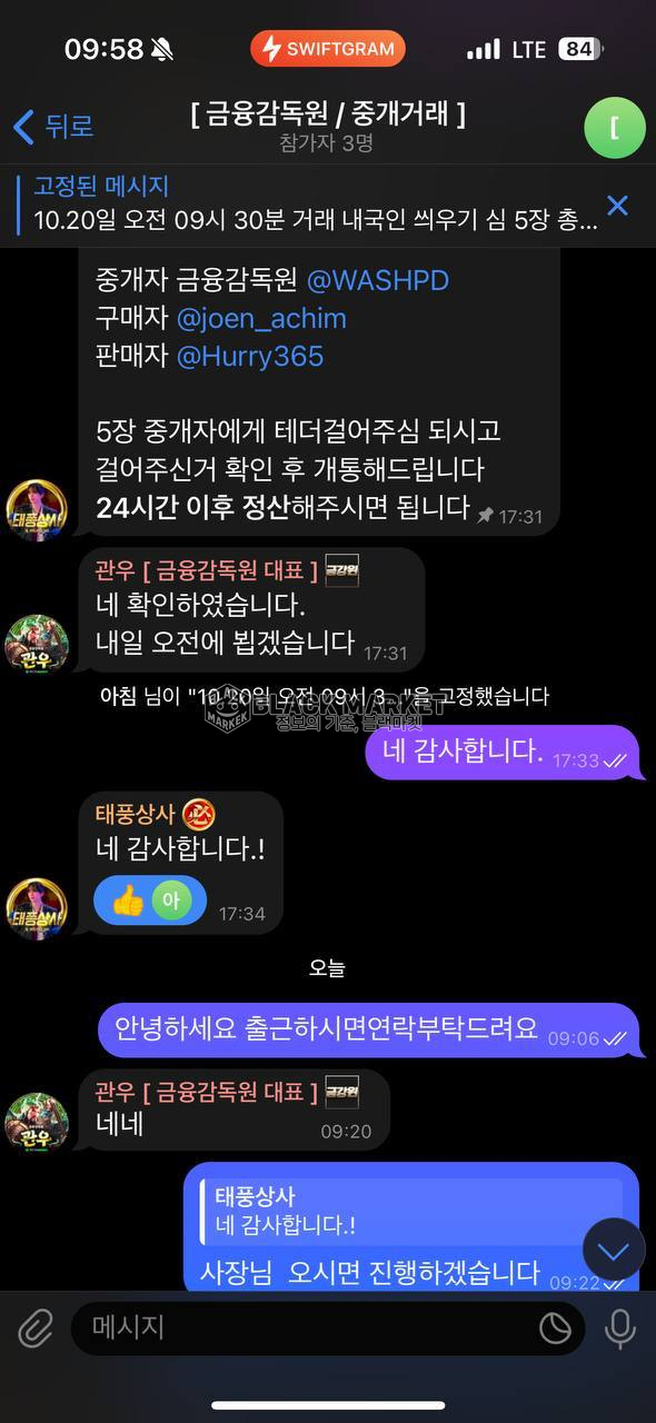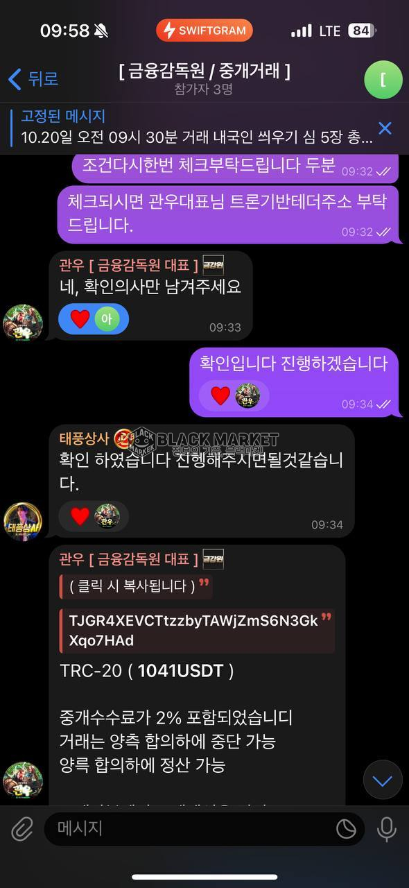- 텔레그램 대화 중 "트레젝션 확인 후 판매자 바로 들어간다" 등 허위 진행 멘트