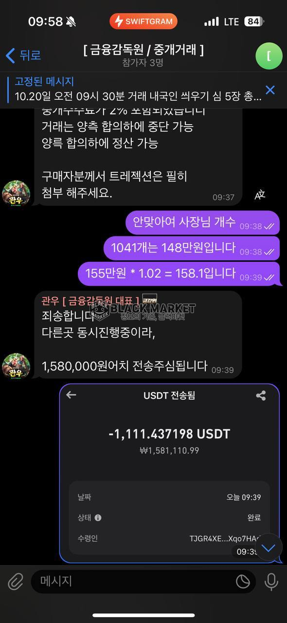 피해자는 관우 대표(@WASHPD)가 제시한 TRC-20 지갑으로 1,111.437198 USDT(₩1,581,110)를 송금했으나, 이후 **판매자와 중개자 모두 연락이 끊김.**