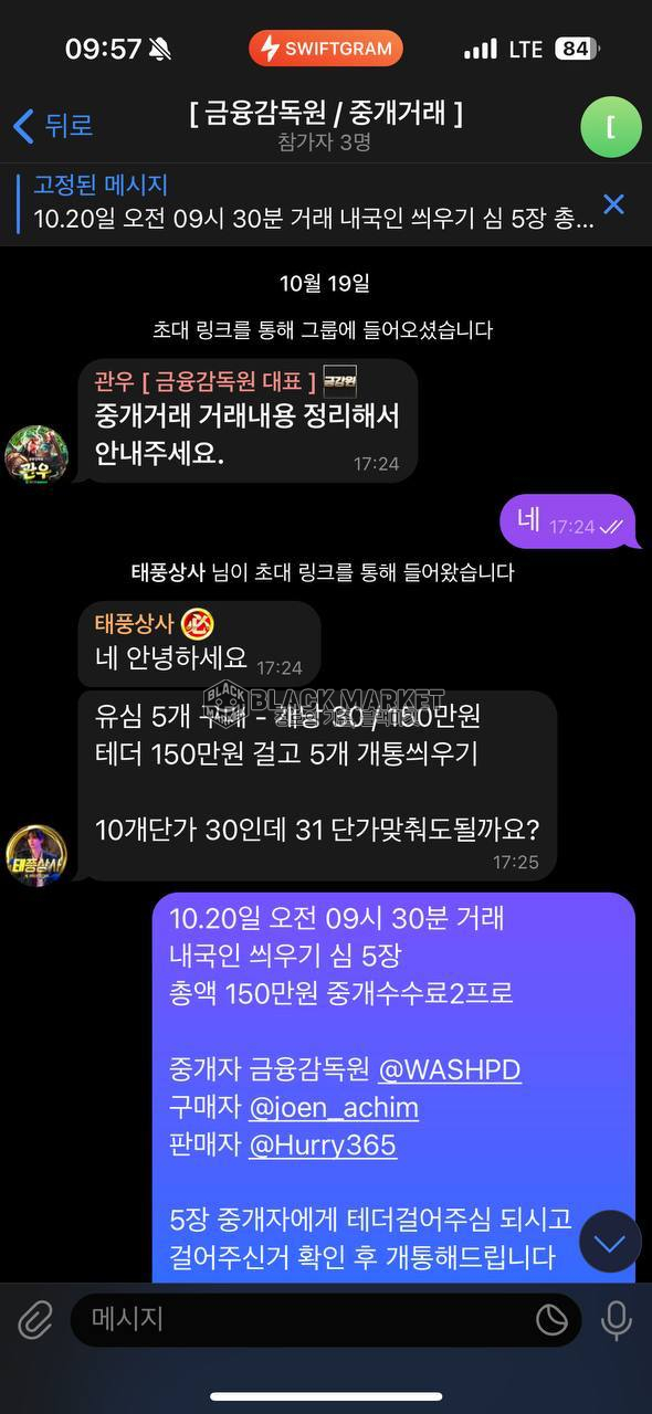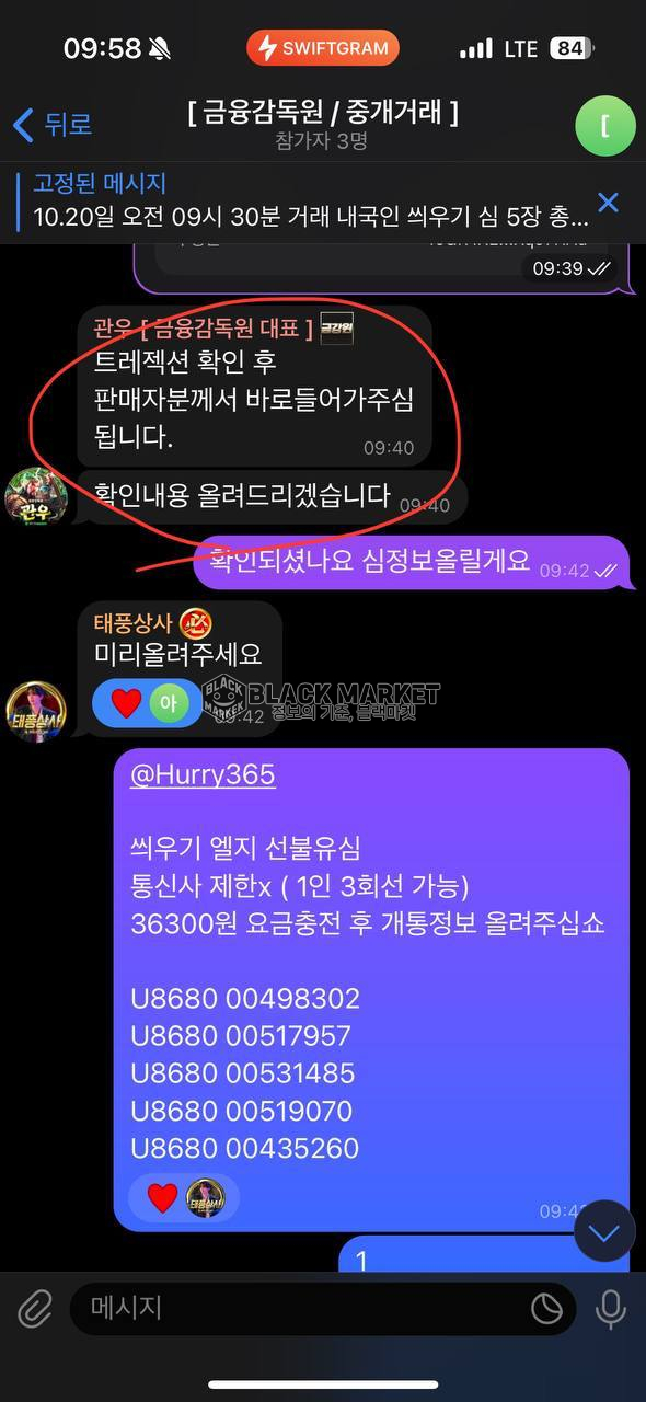 피해자는 금융감독원 채널에서 운영하는 중개거래방을 통해 태풍상사(@Hurry365)와 유심 5개, 총 150만원(테더 1041 USDT) 거래를 진행함.