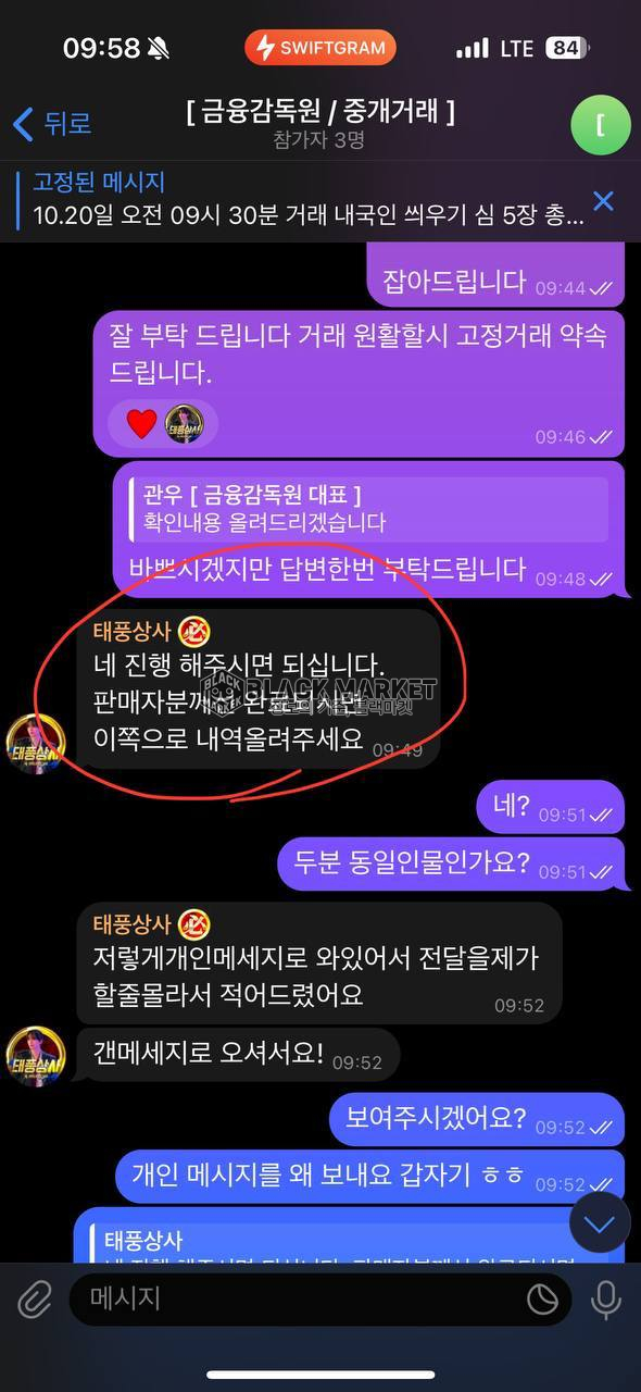 이후 태풍상사는 개인 텔레그램(@huuuui0039)으로 이동하며, 동일 말투 및 내용으로 피해자를 기만한 것으로 확인됨.