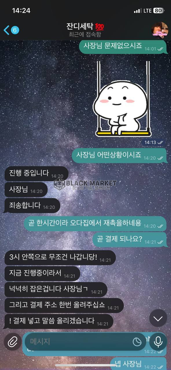이후 “오다집에서 재촉 중이라 곧 결제한다”는 말만 남기고, 약 2시간 뒤 연락 차단 및 잠적.
