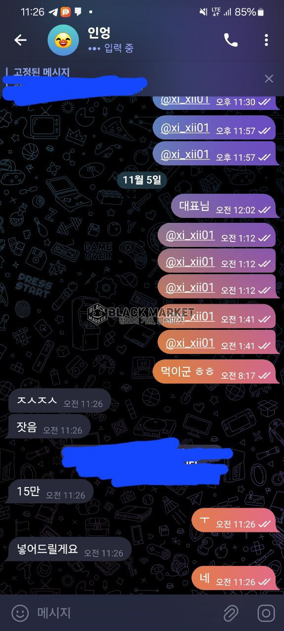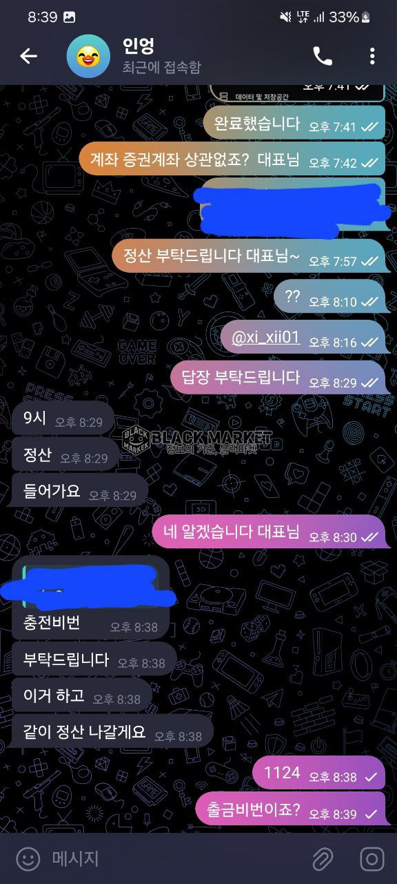 피해자는 텔레그램 ‘인영(@xi_xii01)’ 계정과 카카오 실계정 거래(일명 깡실계)를 진행.