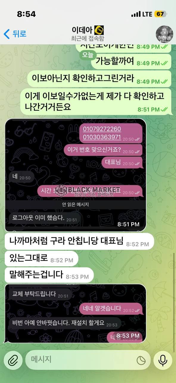 이후 “계정 두 개 다 이보 걸렸다”, “번호 락 풀리면 24시간 뒤 회수 가능하다”는 말을 남긴 뒤