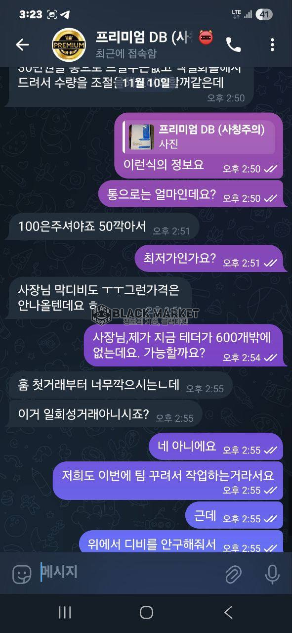 피해자는 텔레그램 그룹에서 프리미엄 DB 계정이 같은 방에 여러 건 올라온 것을 보고 판매자에게 구매문의 하였습니다.